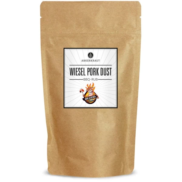 Ankerkrauts Blogger- und Grillfreunde von der BBQ Wiesel Crew haben sich was Feines ausgedacht und ihre Lieblingsgewürze fürs Schweinefleisch gleich userfreundlich zusammen gemischt. Würzig, leicht scharf und nicht zu süß, perfekt für den vielseitigen Einsatz, egal ob Pulled Pork, Ribs, Pork Belly – darf aber auch mal an Huhn oder Pute. Verrückte probieren Crazy Kraut: 500 Gramm Hack mit einer Zwiebel gut durchbraten, dann 300 bis 400 Gramm Sauerkraut, eine Tube Tomatenmark und einen Becher Schmand mitköcheln und mit Wiesel Pork Dust abschmecken. Alles in eine Auflaufform geben und bei 180° Celsius im Backofen goldbraun mit Käse überbacken.Art.-Nr.: 1546872