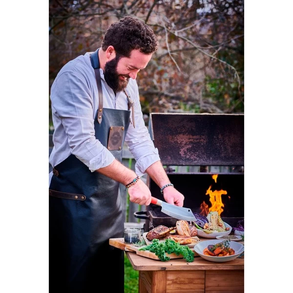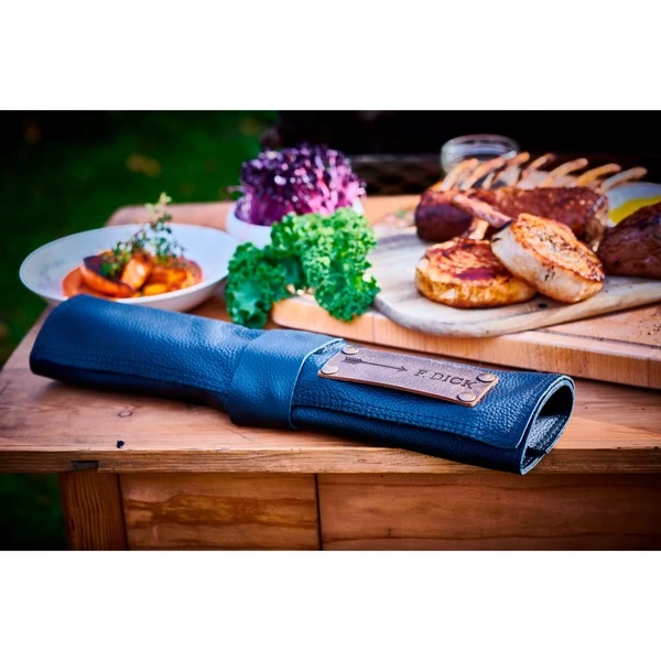 Die robuste Leder-Rolltasche Red Spirit 81768000-01 hat fünf Fächer, die mit fünf hochwertigen Kochwerkzeugen bestückt sind. Sie überzeugt mit geschmeidigem schwarzem Nappa-Leder im Vintage-Look. Durch die verstellbaren, soliden Lederriemen mit Schnallenverschluss können die Messer sicher und stilvoll transportiert werden. Das Set enthält ein Kochmesser „AJAX“ (20cm), ein japanisches Tantomesser (21cm), ein Zerlegemesser „HEKTOR“ mit Kullenschliff (26cm), eine Büffet-Pinzette (25cm) und ein Ausbeinmesser (15cm). Das Red Spirit Kochmesser AJAX ist ein ganz besonderes Messer, die außergewöhnliche Form erinnert an einen Spalter, ein unverzichtbares Werkzeug für die Fleisch-Verarbeitung. Die auffällige Klingenform mit breitem Klingenblatt und geschwungener Schneide eignet sich ideal zum Verarbeiten von Fleisch und Geflügel. Das Red Spirit Kochmesser AJAX ist das perfekte Messer für alle Grillbegeisterten und Fleischliebhaber, die Wert auf das Besondere legen. Wer Fleisch liebt, wird auch das Zerlegemesser „HEKTOR“ lieben. Es ist ideal zum Zerlegen von größeren Fleisch- und Fischstücken, es ist aber auch perfekt als Brisketmesser für den BBQ-Bereich geeignet. Der Kullenschliff reduziert dabei das Anhaften des Schneidguts. Die Red Spirit Messer von DICK sind kompromisslos auf Schärfe ausgelegt. Die Klingen werden extrem schlank ausgeschliffen, zusätzlich ist die Schneide noch poliert. Die runden, typisch asiatisch anmutenden Griffe der Messer besitzen eine außergewöhnliche Haptik. Die Red Spirit Messer sind einfach zu führen und erzeugen einen exakten, sauberen Schnitt. Das Schneidgut wird nicht gequetscht oder gebrochen, die wertvollen Aromastoffe in den Lebensmitteln bleiben erhalten.Art.-Nr.: 1892248