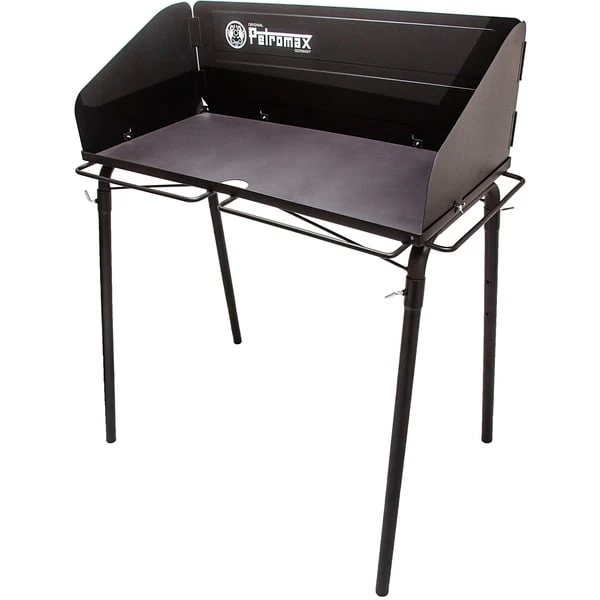Der Petromax Feuertopf Tisch fe90 ermöglicht Draußen-Kochen im großen Stil. Er bietet eine sichere Stand- und Kochfläche für Feuertöpfe in angenehmer Arbeitshöhe von 87cm. Auf dem belastbaren Stahltisch finden je nach Größe mehrere Feuertöpfe oder Grillroste Platz. Der großzügig bemessene Windschutz ermöglicht auch im Freien energie- und kohleeffizient zu kochen. Die vier Standbeine können alternativ auch abgebaut und der Tisch auf eine beliebige, hitzeresistente Unterlage gestellt werden. Vorn und an den Seiten bieten Bügel Platz zum Aufhängen von Kohlezange, Grillhandschuhen und Co. Zum Säubern lassen sich Asche und Kohlereste einfach durch eine Aussparung im vorderen Bereich der Arbeitsfläche ausfegen.Art.-Nr.: 1533664