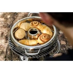 Der Grillrost für den Petromax Camping-Backofen ist eine unverzichtbare Ergänzung, um knusprige Frühstücksbrötchen und Backofengerichte zuzubereiten. Durch die dreifache Luftzirkulation des Camping-Backofens mit Ober- und Unterhitze sowie seitlicher Hitze wird der Grillrost zu einem Backofen zum Mitnehmen. Dank der optimalen Wärmeverteilung lassen sich die Brötchen leicht vom Rost lösen und gelingen immer. Der Grillrost ermöglicht auch das Dampfgaren im Camping Backofen, die drei Füße sorgen dabeifür einen kippsicheren Stand. In den Backofen wird bis zur Mitte der Standfüße einfach Wasser eingefüllt. Die Aromen von Gewürzen und Kräutern, mit denen das Grillgut gewürzt wird, lösen sich und sorgen für ein intensives Geschmackserlebnis, während alle wichtigen Vitamine und Nährstoffe erhalten bleiben. Da die Ringe des Grillrosts nahe beieinanderliegen, können kleingeschnippeltes Gemüse oder Fleischstreifen, aber auch Fischfilet, Meeresfrüchte oder Marshmallows und Desserts auf dem Grillrost zubereitet werden. Dank der vielfältigen Verwendungsmöglichkeiten kann der Grillrost auch als Untersetzer für den Camping-Backofen verwendet werden, um den Campingtisch oder den Untergrund vor Hitze zu schützen. Auch anderes Kochgeschirr, wie der Perkolator oder ein kleiner Feuertopf, kann darauf abgestellt werden. Der Grillrost ist aus hochwertigem Edelstahl gefertigt und lässt sich nach Gebrauch leicht mit Spülmittel und einem Lappen säubern. Mit seinem geringen Gewicht ist er der perfekte Begleiter für jeden Ausflug. Er findet mühelos Platz in der Reißverschlusstasche der Transporttasche für den Camping Backofen ta-camp-oven und ist so vor Kontaktkorrosion geschützt. Er ist immer in greifbarer Nähe, wenn man mit dem Camping Backofen auf die nächste Reise geht.Art.-Nr.: 100021546