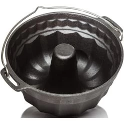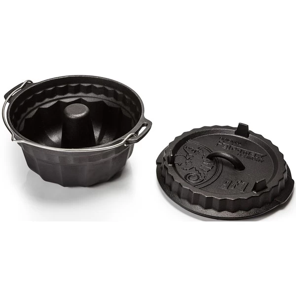 Mit der gusseisernen Gugelhupfform gf1 von Petromax backt man nicht nur leckeren Kuchen, auch frisches Brot und Aufläufe gelingen in der klassischen Kranzform ideal. Der Gussdeckel der Form vereint mehrere Anwendungsmöglichkeiten: Er ermöglicht das Backen mit Oberhitze in der Draußen-Küche und verfügt umgedreht über eine Tortenbodenfunktion. Die gusseiserne Gugelhupfform mit dem praktischen Tragehenkel aus Edelstahl zum Aufhängen ist hervorragend für das Backen und Kochen über offenem Feuer geeignet, kann aber auch problemlos für das Backen im Backofen verwendet werden. Das Gusseisen der Gugelhupfform stellt sicher, dass die Wärme effizient gespeichert und gleichmäßig an das Backgut weitergeleitet wird. Außerdem ist die Oberfläche bereits vorbehandelt (seasoned finished) und macht somit ein erstmaliges Einbrennen unnötig. Auf dem Deckel der Gugelhupfform lassen sich dank erhöhtem Rand Glut oder Holzkohle einfach platzieren. Auf diese Weise werden Kuchen, Brot oder Auflauf gleichmäßig gar. Doch die Form bietet noch mehr. Der Deckel mit Tortenbodenform kann umgedreht zum Backen von Tortenböden sowie für leckere Quiches und Tartes genutzt werden. Auf seine drei Füße gestellt, dient er zudem als Pfanne oder als praktische Servierplatte.Art.-Nr.: 1533728