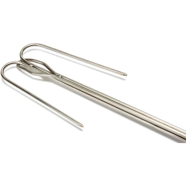 Mit Hilfe der Lagerfeuer-Spieße ls2 von Petromax kann man endlich zusammen am Feuer sitzen und am „verlängerten Arm“ Würstchen, Gemüse, Stockbrot und Co. mundgerecht braten. Die Spieße sind beide in der Länge verstellbar, so ist immer für einen ausreichend sicheren Abstand zum heißen Feuer gesorgt. Da sie aus rostfreiem Edelstahl gefertigt sind, können die Lagerfeuerspieße nach Gebrauch einfach gereinigt werden. Der Griff der Spieße besteht aus hochwertigem Buchenholz und liegt dank der eingearbeiteten feinen Rillen gut und sicher in der Hand. Der Lagerfeuer-Spieß ls2 ist mit seinen beiden komplett nach hinten umgebogenen Zinken besonders gut für das Grillen mit Kindern geeignet. Auf diese Weise können die Leckerbissen kaum abrutschen oder ins Feuer fallen. Mit der Bohrung am Griffende werden die Lagerfeuer-Spieße anschließend einfach und platzsparend verstaut. Jede Packung enthält zwei Spieße.