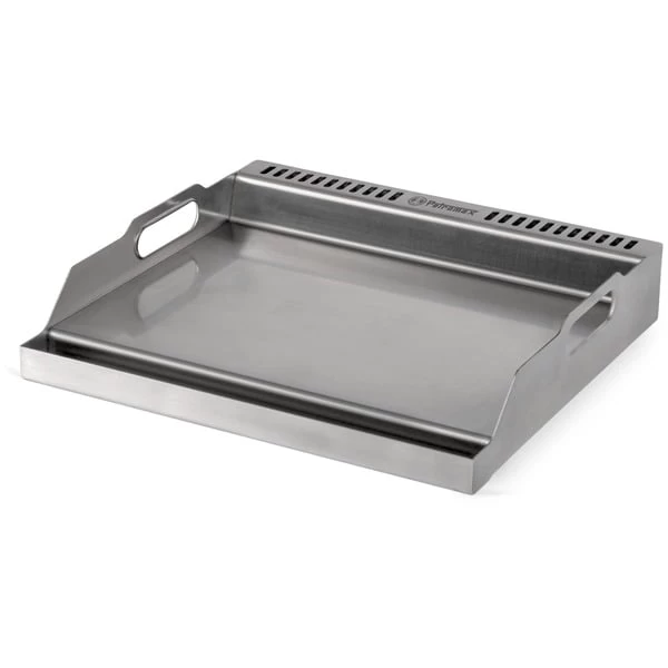 Mit der Plancha Grillplatte von Petromax erweitert man den Petromax Gastisch um eine typisch spanische Plancha-Platte mit durchdachten Details. Die Grillplatte aus Edelstahl ermöglicht dank unterschiedlicher Temperaturzonen beste Ergebnisse. Hier brutzeln deftige Fleischspezialitäten extra saftig, während zeitgleich Grillgemüse oder würzige Shrimps am Rand bei geringerer Hitze darauf warten können, serviert zu werden. Mit Hilfe der praktischen Henkel kann man die Platte einfach auf den Gastisch legen, sie passt auf alle Modelle mit Einzel- und Mehrfachbrenner. Fettarmes Grillen gehört von nun an selbstverständlich dazu, da die Auffangrinne an der vorderen Kante während des Grillens dafür sorgt, dass Fett aus den Speisen abläuft und nicht in Kontakt mit der Flamme kommt. Anders als beim Grillrost bleiben auch gefüllte Champignons, Kartoffelspalten oder Wassermelonenstücke sicher auf der Grillplatte liegen. Schlitze am oberen Teil der Grillplatte sorgen für die notwendige Belüftung und vermeiden einen Hitzestau. Nach dem Grillen kann die abgekühlte Plancha an den Tragehenkeln vom Gastisch genommen und einfach separat gereinigt werden. Als optimale Erweiterung für den Gastisch bietet die Edelstahl-Plancha alle Vorteile des spanischen Grillens für vielfältige Grill-Ergebnisse in der Campingküche.Art.-Nr.: 1881588