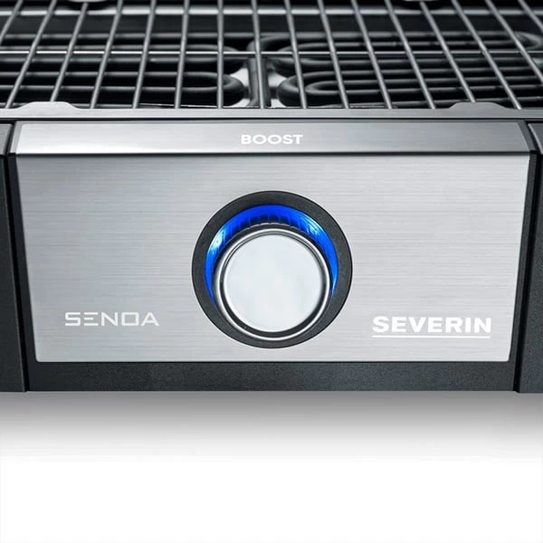 Der SEVERIN Elektro-Tischgrill SENOA BOOST für drinnen und draußen überzeugt besonders durch Leistung: 3.000 Watt und die innovative Doppelheizungs-Technologie sowie eine speziell entwickelte Reflektorschale ermöglichen eine Spitzentemperatur von von bis zu 500°C direkt am Grillgut. Die leistungsstarke Boost-Zone ist so abgeteilt, dass auch ein ZweiZonen-Grillen auf der ca. 41 x 24cm großen Grillfläche möglich ist. Das Thermostat mit großem Drehregler und klarer Skalierung lässt sich leicht bedienen. Ein weiteres Highlight ist die Status-LED-Beleuchtung, die zwischen Orange (Grillen) und Rot (BoostZone) wechselt und so anzeigt, welcher Temperaturbereich auf dem Grill in Benutzung ist. Ein Sicherheits-Mikroschalter stellt das Heizelement bei Entnahme automatisch ab. Der Edelstahl-Grillrost und viele weitere Teile sind entnehmbar, wodurch eine leichte Reinigung möglich ist.Art.-Nr.: 1862299