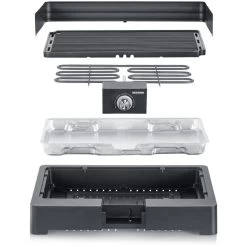 Der BBQ-Tischgrill 8562 von Severin ist flexibel einsetzbar, indoor und outdoor. Er verfügt über eine gerippte Grillplatte mit 44 x 26cm Grillfläche, der ein ansprechendes Grillmuster auf Steaks, Fisch, Würste und viele andere Gerichte zaubert. Auch Low-Fat-Grillen ist möglich, denn die Bratflüssigkeit tropft in eine Wasserschale ab. Das Wasser in der Reflektorschale sorgt außerdem für leichte Reinigung und verhindert Fettbrand und Rauchbildung. Die hohe Leistung und der 8cm hohe Windschutz bringen den Tischgrill schnell auf Temperatur, dabei kann die Temperatur stufenlos eingestellt werden, was für perfekte Grillergebnisse sorgt. Dank des SafeTouch-Gehäuses besteht keine Verbrennungsgefahr an den Oberflächen. Der BBQ-Tischgrill 8562 überzeugt durch schnelles und einfaches Zusammensetzen bzw. Auseinanderbauen und ist nicht nur rasch einsatzbereit, sondern auch leicht zu reinigen.Art.-Nr.: 1740660