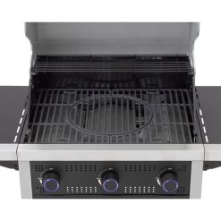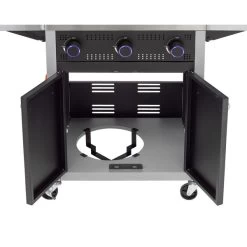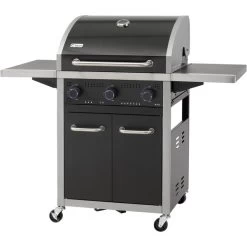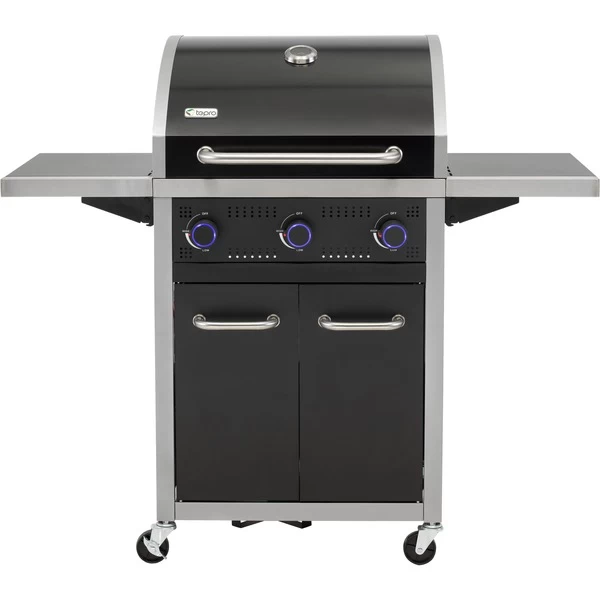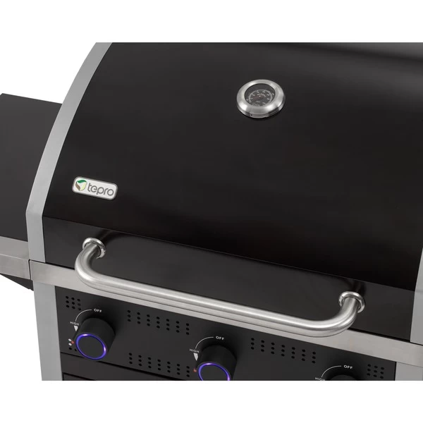 Der Gasgrill Northport 3 von Tepro ist in einen stabilen Grillwagen integriert und mit vier Lenkrollen ausgestattet. Die geteilte Grillfläche aus Gusseisen verfügt über einen herausnehmbaren Grillrosteinsatz für das tepro Rost in Rost System und einen zusätzlichen emaillierten Warmhalterost. Im Deckel mit Edelstahl-Griff ist ein Thermometer integriert, um jederzeit die Temperatur überprüfen zu können. Der Gasgrill Northport 3 bietet außerdem zwei abklappbare Seitenablagen, Drehregler mit LED Beleuchtung und eine in die Regler integrierte Piezo-Zündung. Heruntergetropftes Fett lässt sich nach dem Grillen dank der Fettauffangschublade mit Griff auf der Rückseite leicht entnehmen und entsorgen. Im geräumigen Unterschrank befindet sich hinter den beiden Türen noch zusätzlicher Stauraum und eine Gasflaschenhalterung für 5kg-, 8kg- und 11kg-Gasflaschen. Art.-Nr.: 1676265