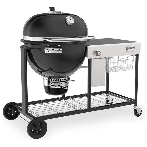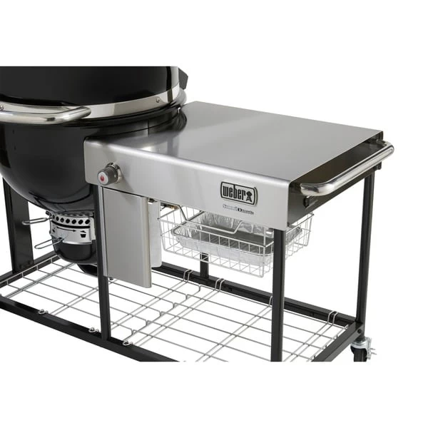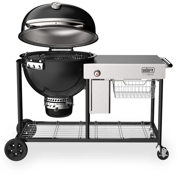 Das Holzkohlegrill-Center Summit Kamado S6 von Weber aus langlebigem, doppelwandig isoliertem Stahl erreicht schnell die gewünschten Temperaturen, hält die Hitze konstant, und dank des Snap-Jet Gas-Anzündsystems ist das Anfeuern der Holzkohle extrem einfach auf Knopfdruck. Damit eignet er sich für ganztägiges Räuchern, während gleichzeitig die benötigte Holzkohlemenge minimiert wird. Mit der besonders großen Grillfläche von 61cm Durchmesser kann man mit dem Summit Kamado auf jedem Fest auch für viele Gäste grillen. Durch einfaches Umsetzen des Grillrosts kann man den Kamado in einen normalen Holzkohlegrill verwandeln, um Steaks anzubraten, Hähnchen zu grillen oder Fisch zu räuchern. Der 2-fach verstellbare Holzkohlerost ist ideal zum Räuchern oder Anbraten bei hoher Hitze. Der Deckellüfter Rapidfire fördert dabei den Luftstrom, um schnell eine hohe Hitze zu erreichen. Der Summit Kamado S6 ist mit dem integrierten Gourmet BBQ System ausgestattet, mit den unterschiedlichen separat erhältlichen Einsätzen kann man seiner Phantasie beim Grillen freien Lauf lassen. Der offene Grillwagen mit Edelstahl-Seitentisch, Korbschublade und großer Gitter-Ablage bietet jede menge Stauraum für Grillbestecke und Zutaten. Das One-Touch-Reinigungssystem ermöglicht nach dem Essen ein problemloses Säubern des Grills. Die Stahlkonstruktion und die porzellanemaillierte Beschichtung sorgen für eine besonders lange Haltbarkeit.Art.-Nr.: 1694185